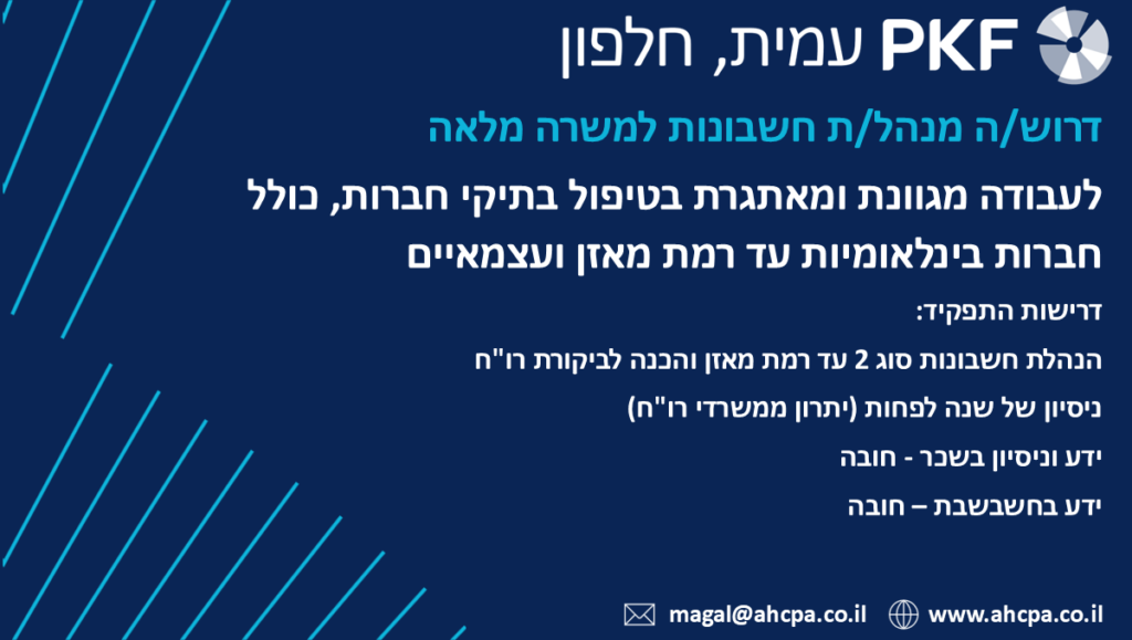 דרוש/ה מנהל/ת חשבונות בעל/ת תעודה סוג 2 ומעלה לעבודה מגוונת ומאתגרת בטיפול בתיקי חברות, כולל חברות בינלאומיות עד רמת מאזן ועצמאיים